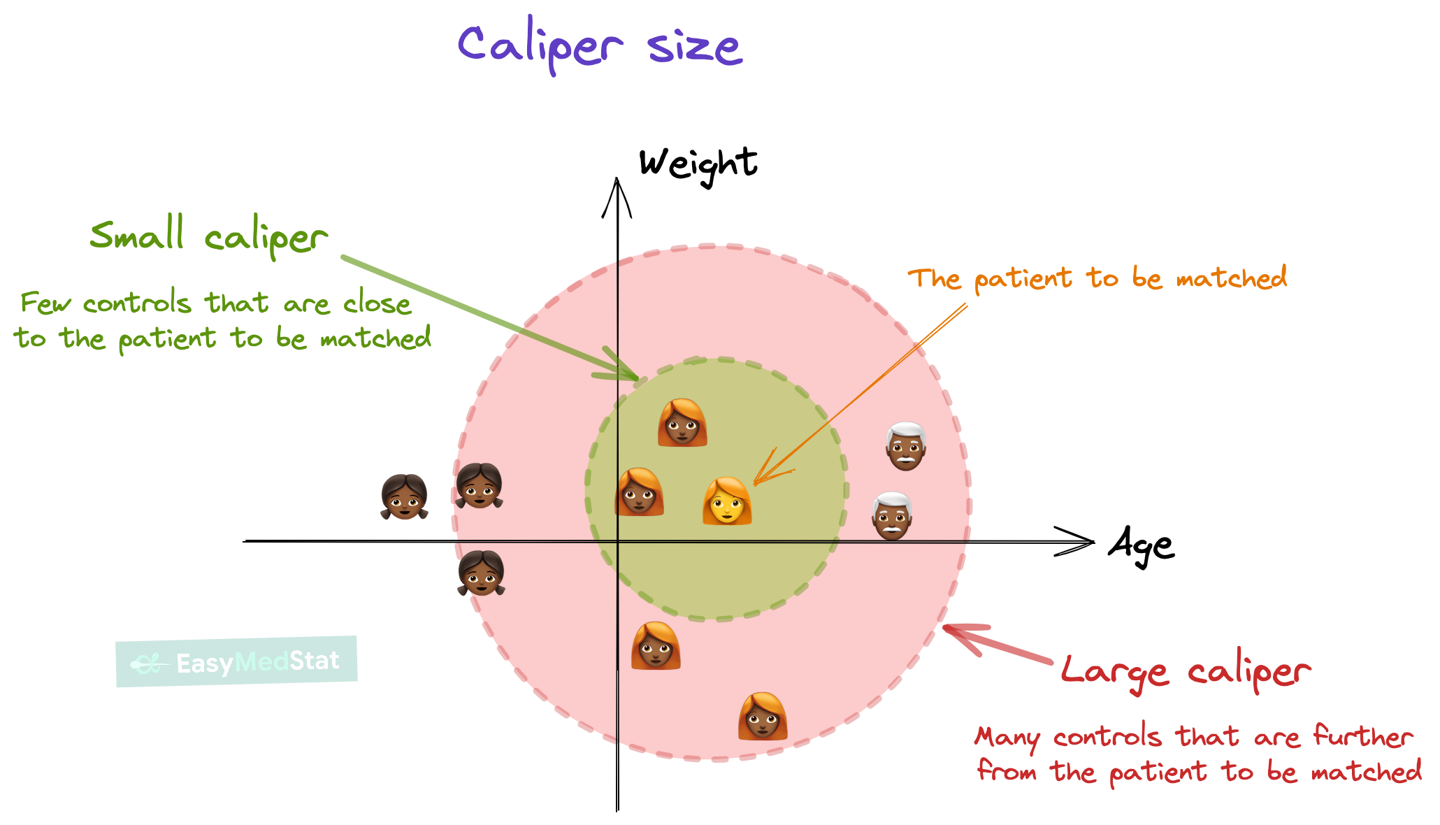 Selecting on these covariates will be determined by a matching algorithim commonly referred to as a matching method. For each of the subsequent matching methods, you can determine the degree of tolerance between matching across treatment and control units. The diagram visually show how this varies by the caliper size (viz., degree of tolerance). Caliper size has a tradeoff. The smaller the caliper, the closer the match. But larger the caliper, the larger the selection of controls.