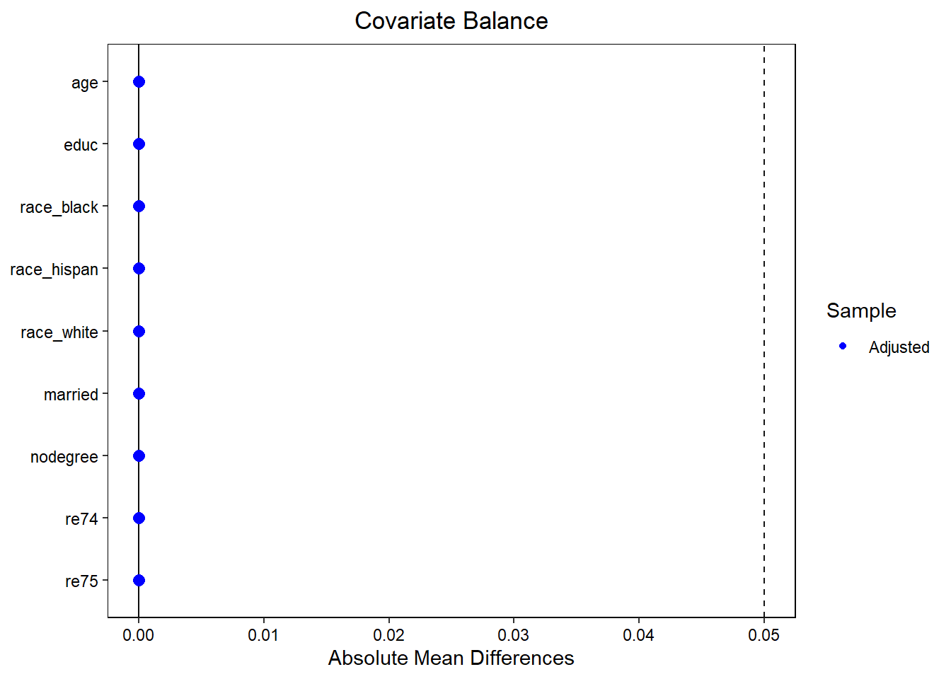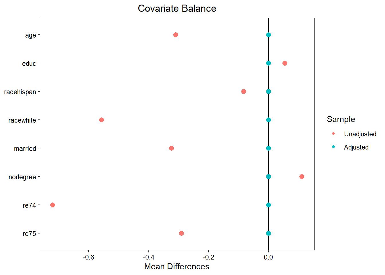 # Standardized mean differences should be ~0bal.tab(treat ~ age + educ + race + married + nodegree + re74 + re75, data = df,weights ="weight",stats ="m")# Variance ratios should be ~1bal.tab(treat ~ age + educ + race + married + nodegree + re74 + re75,data = df, weights ="weight",stats ="v")