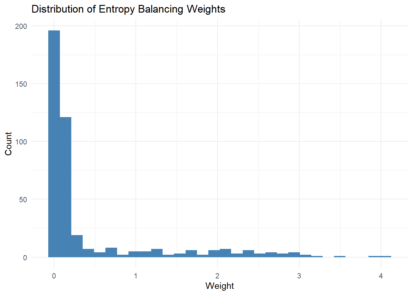 # Check for extreme weightsquantile(eb_weight, c(0.95, 0.99, 1.0))# Flag extreme weightsextreme <- eb_weight >quantile(eb_weight, 0.99)table(extreme)